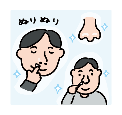 ワセリン※を塗った状態で花粉が鼻に入ると、花粉がワセリンにくっついて中のアレルギー物質が鼻の中に飛び散りにくくなります。帰宅後は鼻をかんでワセリンをふき取りましょう。