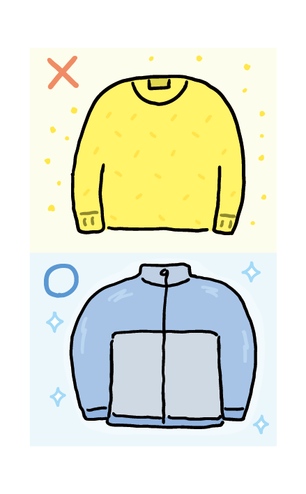また花粉は静電気が発生するとつきやすくなるため、帯電しにくい素材(例:綿)もおすすめ。化繊でもポリエステル素材(例:フリース)とナイロン素材(例:ダウンジャケット)を重ね着すると静電気が発生しやすくなるので、避けたほうがよいでしょう。 -