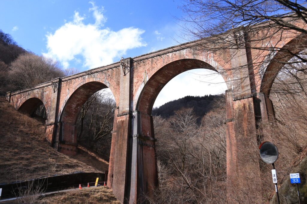 明治25年に完成した美しいレンガ造りの4連アーチ橋。川底からの高さが31m、長さは91mあり、わが国最大級。通称「めがね橋」として親しまれ、国の重要文化財に指定されている。